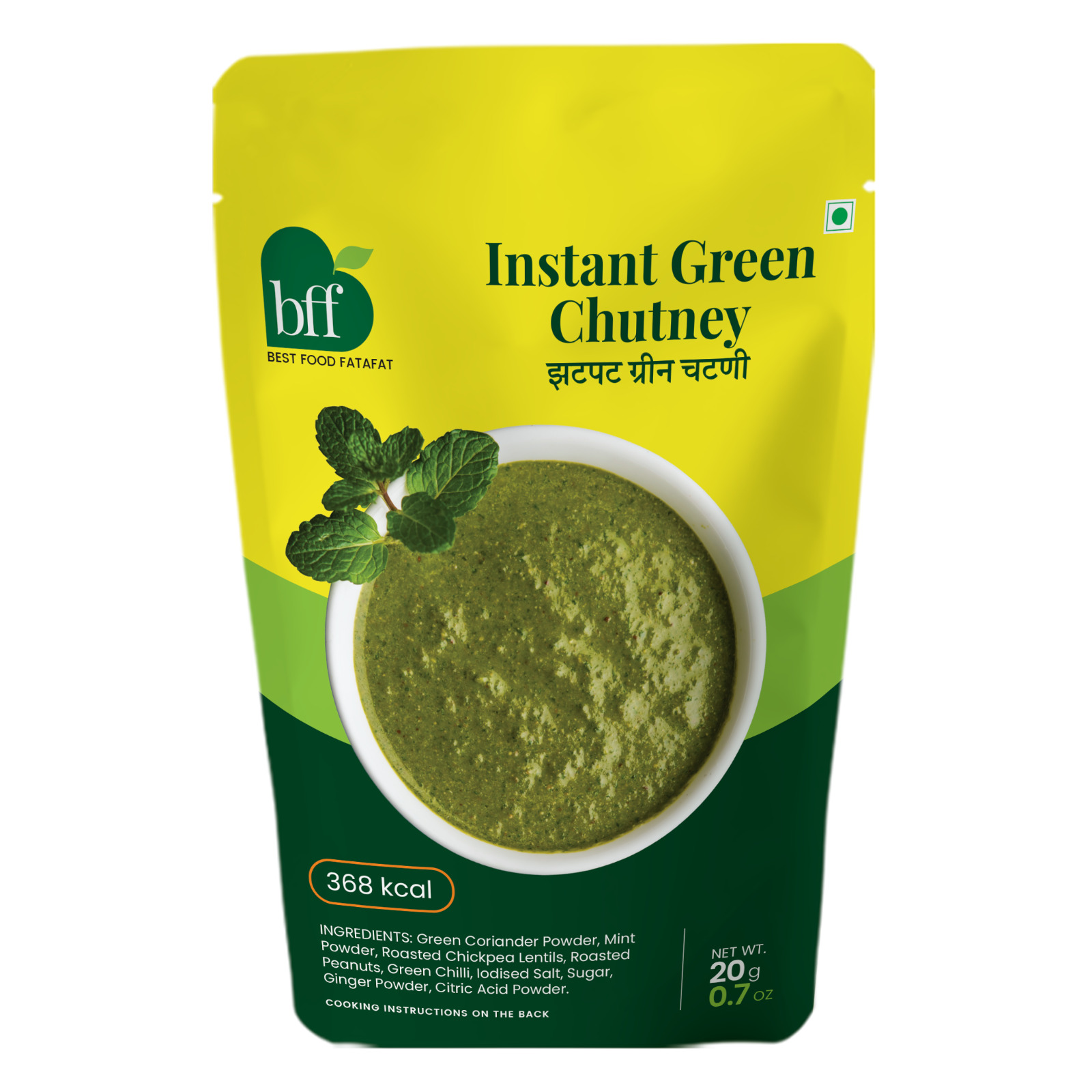 Green Coriander Powder,Mint Powder,Roasted Chickpea Lentils,Roasted Peanuts,Green Chilli,Iodised salt,Sugar,Ginger Powder,Citric acid powder.