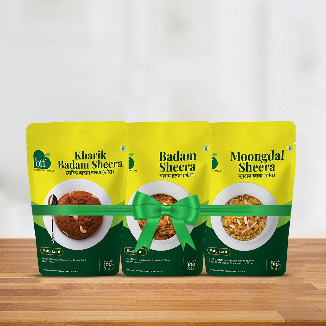 1 Badam Sheera, 1 Moong Dal Sheera, 1 Badam Kharik Sheera